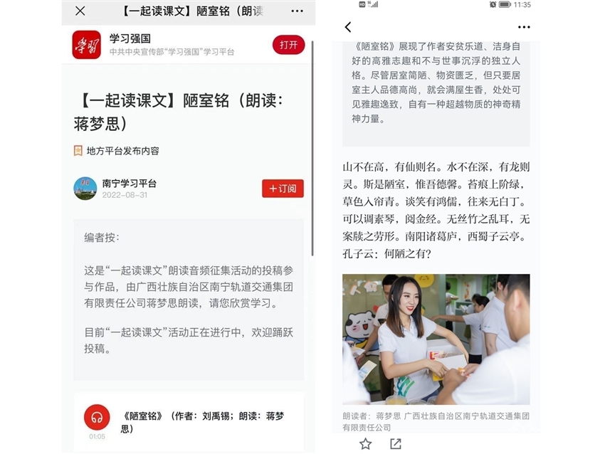 軌道地產商業(yè)公司黨支部蔣夢思同志參加了此次活動,她朗讀的作品《陋室銘》經(jīng)南寧軌道交通集團推選,榮登“學習強國”平臺,在“一起讀課文”欄目展播。